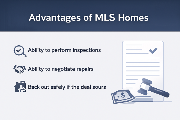 MLS homes offer clean, verifiable titles, standard contracts, and predictable timelines. Off-market deals can involve limited oversight, rushed deadlines, or questionable practices. For beginner investors or out-of-state, sight-unseen buyers, the MLS route is far safer and more straightforward.