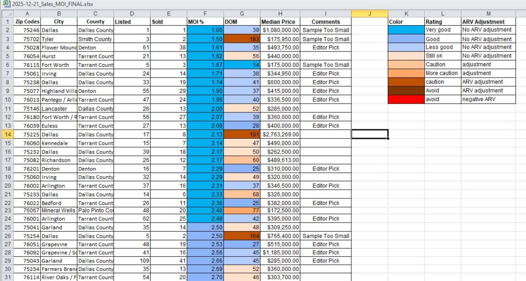 I’ll send you the December update and explain how to use it to 1) know which zip codes are trouble makers and which are solid; 2) how to adjust your ARV if you have a deal being offered to you in less-than-stellar zip code.